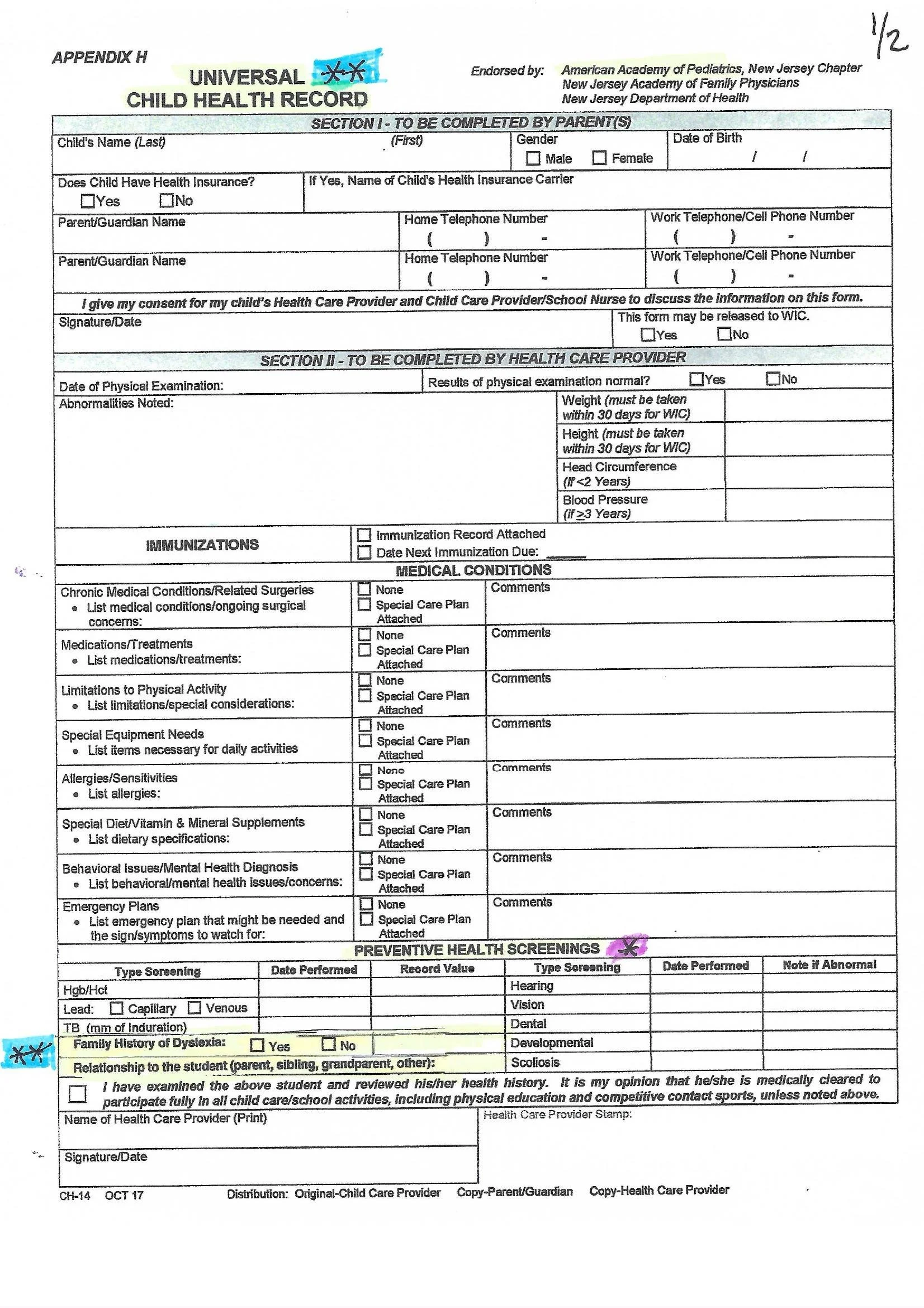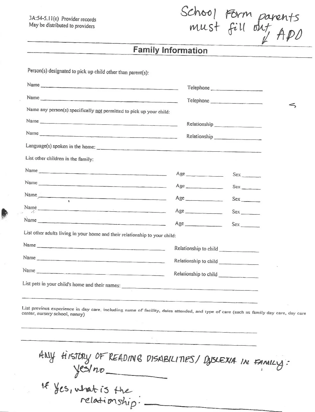 We need two additions regarding a child’s family history of dyslexia: 1. The Universal Health Record (done at the pediatrician’s office after the physical). 2. The screening form filled out by the parents, for the student to enroll in Pre-K or Kindergarten.